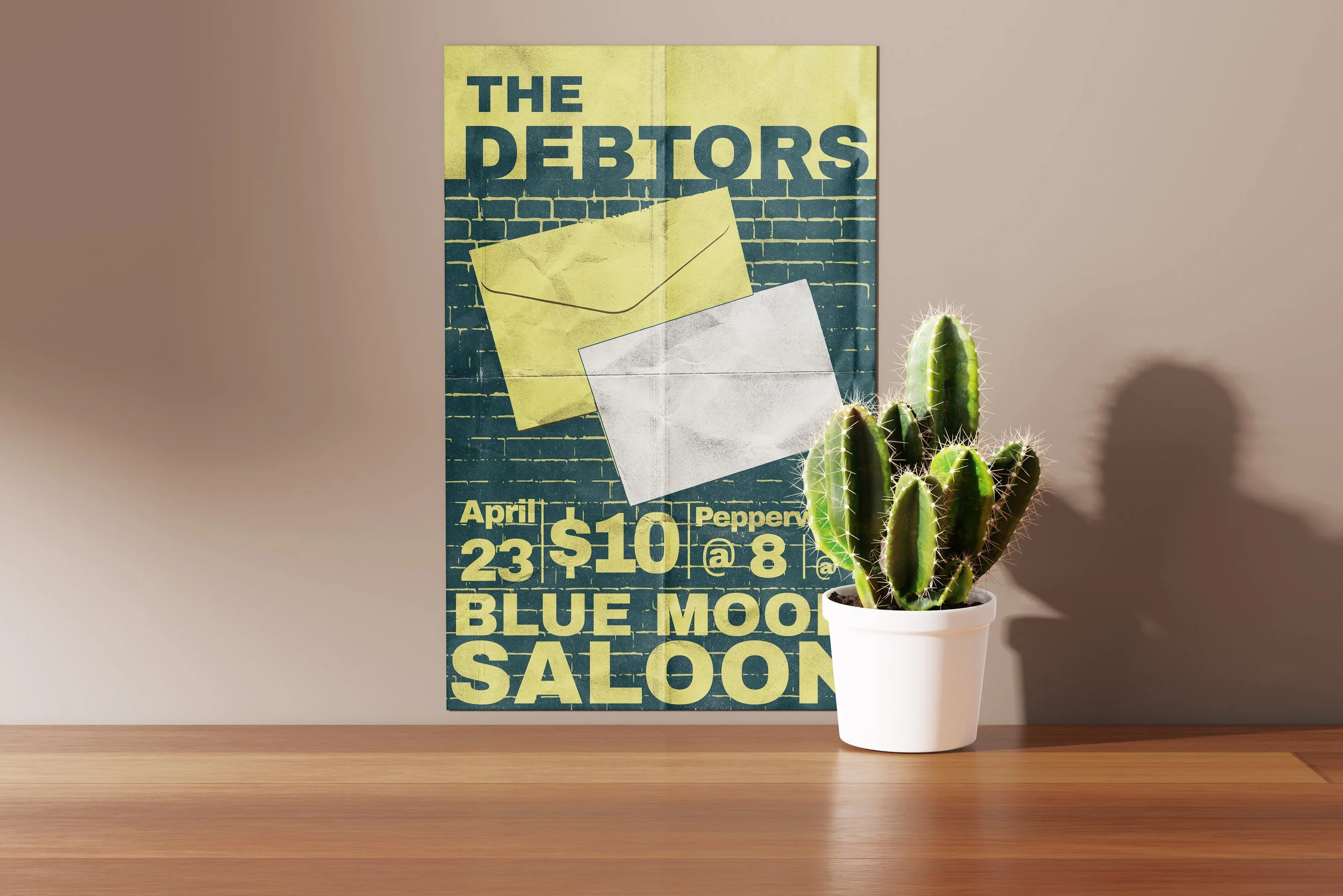 Being an indie band, they didn't have a ton of specific design elements they wanted included, but they frequently use envelope icons in their imagery, which I decided to reflect in the design. Next, I added the text in large, bold fonts to draw attention to the poster. I also wanted to add a grungy texture to the design to feed into the indie rock vibe that the band thrives in.